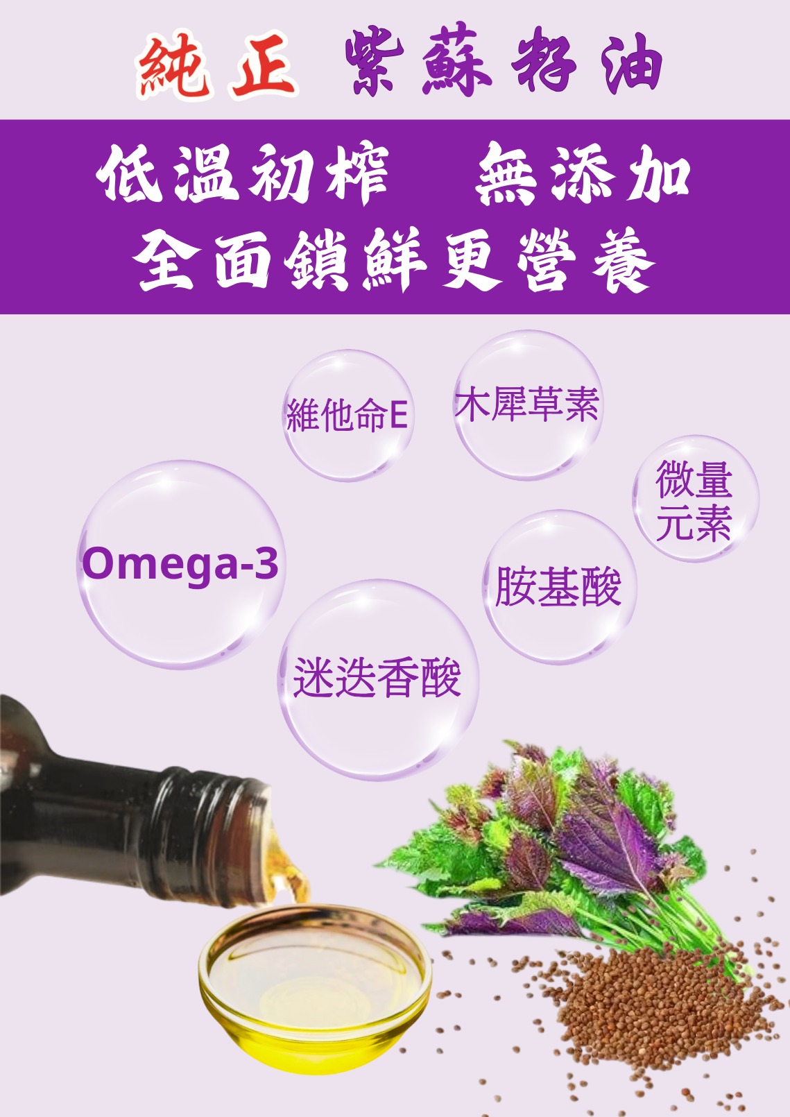 紫蘇籽油富含多種營養素,其中最主要的是Omega-3,含量可達55%-65%,是目前世界上已知 Omega-3 含量最高的植物油,被譽為「陸地上的深海魚油」。此外,它還含有豐富的維生素E、礦物質(如鈣、鎂、鉀)以及木犀草素、迷迭香酸和多種胺基酸。